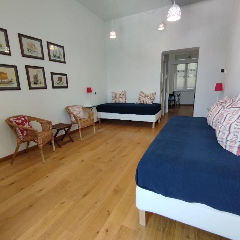 Appartement (rénové) pouvant accueillir jusqu'à quatre personnes ; composé de : chambre double avec fenêtre, séjour avec deux/trois lits simples et balcon avec vue sur la mer, deux salles de bain (une complète), cuisine avec fenêtre.